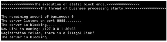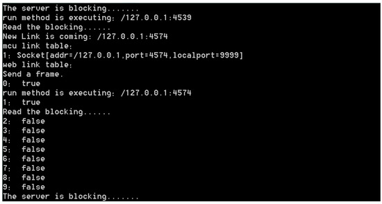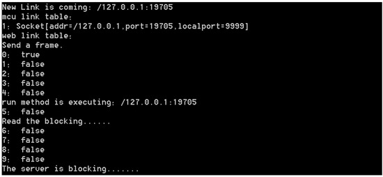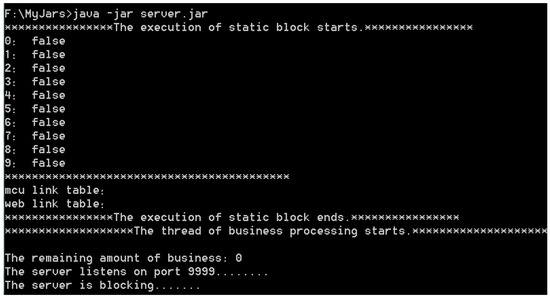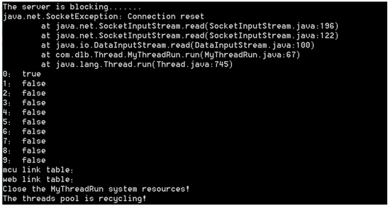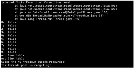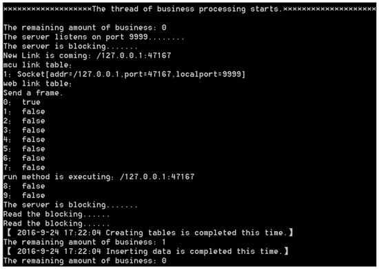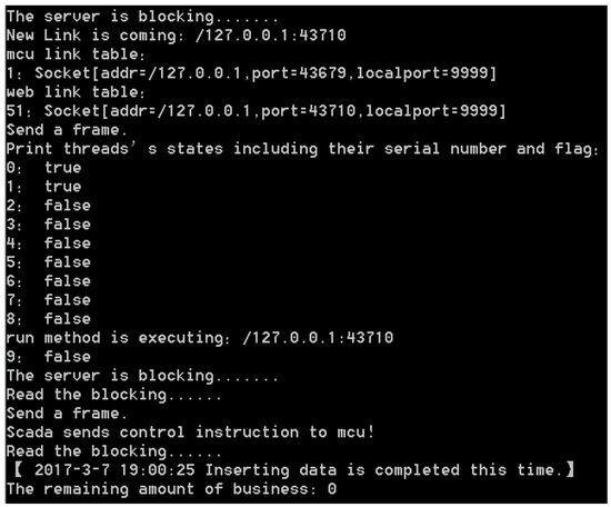 First, “net start mysql” was entered to start the MySQL database at the command line console before “java -jar server.jar” was entered to start the SCADA system. When the SCADA system starts, it will create a “ServerSocket” connection socket, which provides two parameters to bind the IP address and port number of the computer. Next, the system starts to read the configuration file, and will complete reading the configuration information and load the startup module in the configuration file by the static block. As known, the static block is executed during the initialization stage of the JVM loading and is executed only once. The system creates a threadPools when it first loads the startup module. The maximum capacity of the threadPools is obtained from the configuration file and creates a certain number of threads into the threadPools in advance according to 10% of the maximum capacity in the threadPools. Following this, the system creates two link tables: the central controller link table (mcu link table) that records the lower central controllers connection information, and the upper WEB monitoring system link table (web link table) that records the upper WEB monitoring system connection information. Finally, the system invokes the “accept” method of the “ServerSocket” connection socket to block and wait for the connection requests from clients. The results show these threads’ states, including their serial number and a flag that marks if was used or not. Test results are shown in Figure 3 and Figure 4.