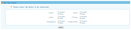 In this upper WEB monitoring system, the administrator can control six parts of the microgrid hardware platform: Load 1, Load 2, Load 3, PV array, Wind generator and Storage battery. When the power generation is insufficient to supply all loads, the administrator can instruct the system to disconnect one load to the microgrid system. As seen in Figure 12, the administrator selects Load 1 to be disconnected from the microgrid system and clicks the “Confirm” button in the WEB monitoring system, and the background program will form a frame of control according to the instructions of the foreground interface. Then, the control frame will be sent to the SCADA system through the IO stream of socket. Next, the SCADA system sends the instruction to the central controller through the UART Ethernet module after parsing this instruction and inserts this operation into the “microEventTable” of the MySQL database as shown in Figure 13 and Figure 14. Finally, the microgrid hardware platform carries out the instruction to cut off Load 1 (four light bulbs) to make the microgrid safe and stable (Figure 15).