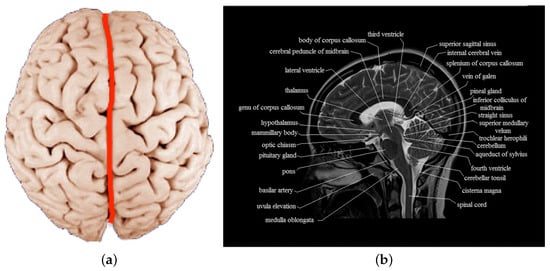 (a) inter-hemispheric fissure in a normal human brain; and (b) different brain anatomical structures from sagittal cross-section in a magnetic resonance (MR) image (courtesy of [5]).