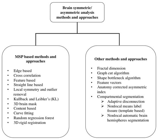 Due to the aforementioned limitations in MSP based brain hemisphere segmentation, other computational methods and approaches have also been developed in recent times, e.g., fractal dimension [16], graph-cut algorithm [17], shape bottleneck algorithm [18], etc., in order to segment the left and right hemispheres for brain symmetric/asymmetric analysis. In the following section, we describe and review in detail the existing computational techniques developed and used for brain symmetric/asymmetric analysis to detect, analyze and treat various human brain disorders. These existing methods are categorized into two major classifications, and they are represented in Figure 2.