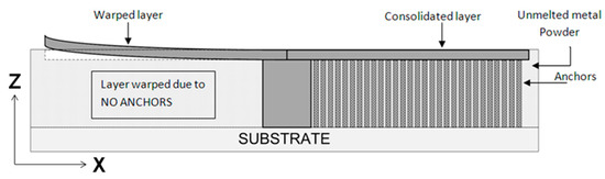 Removing or alleviating stress build up and the requirement for anchors within SLM can be achieved by preventing parts from completely solidifying during processing or maintaining in a stress reduced state. Anchorless Selective Laser Melting (ASLM) or Semi-Solid Processing (SSP) has been developed to prevent processed metal from completely solidifying during an SLM build [7,8].