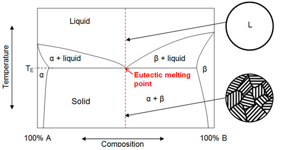 This is achieved by forming a eutectic alloy or eutectic system (hyper/hypo eutectic) from two or more compositionally distinct materials and maintaining the powder bed pre-heating close to the eutectic melting/solidification point of the newly in process formed alloy. Figure 2 shows a simple binary eutectic phase diagram. Alpha, beta, solid and liquid phases are shown with respect to varying material compositions and temperature; TE represents the eutectic melting point. Eutectic material proportions can vary from the exact eutectic point creating hypo or hyper eutectic (alloys containing a eutectic system) with variable solidification temperatures and material properties. The range of compositions that have the potential to form eutectics is broad, ranging from aluminium alloys to higher temperature nickels.