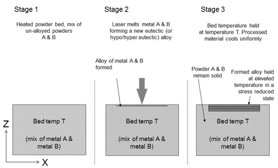 Figure 3 illustrates the ASLM method and its use of eutectic materials. A batch of material A and B powder is mixed in their un-alloyed eutectic proportions. These materials are then deposited during the ASLM process while maintaining the bed temperature near the eutectic point of the alloy but less than the melt temperature of the individual un-alloyed powder (to prevent melting and agglomeration of un-processed feedstock). It may still be possible to pre-heat the powder bed to temperatures below the eutectic melt point so that stresses are not developed or are sufficiently relieved. Stresses can be sufficiently relaxed if the bed temperature allows diffusional relaxation of the material [9]. Dependent on the material, these relaxation kinetics are initiated at between 40% and 60% of the solidification temperature of the material; this is also time dependent. When the laser scans regions of the powder bed, the individual powders A and B will melt and form a eutectic alloy in-situ; this forms a new solidification temperature that will now only solidify at temperatures below the eutectic solidification point. Since the bed temperature is set near the eutectic point, the melted/alloyed regions will not rapidly solidify or if they are within the diffusional temperature range, they will generate less residual stress than those formed during conventional SLM (rapid melting/solidification rates). Eutectic compositions such as Al66Mg offer large processing windows of 212 °C (temperature difference between eutectic melt point and lowest melting point of individual un-alloyed material). A large processing window may be advantageous as the bed temperature control would not need to be regulated as precisely compared to that of a small processing window. Furthermore, a large processing window may reduce unwanted solid state sintering of unprocessed powders due to pre-heat temperature being far lower than the melt temperature of the un-alloyed material. This solid state sintering or “caking” of material can cause material deposition issues due to powder agglomeration.