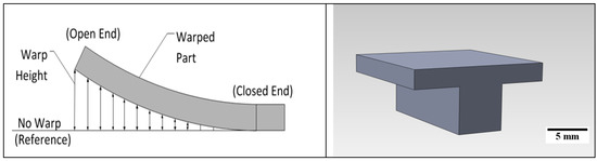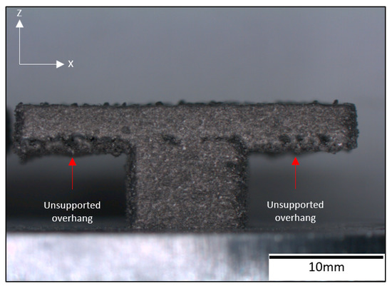 As a measure of ASLM stress reduction capability, a warp measurement was carried out on “T” shaped test samples built as part of this study. The sample design was chosen due to the requirement for adding supports to overhanging surfaces during conventional SLM processing; measuring geometric distortion is an efficient methodology for quickly quantifying the level of residual stress within SLM components [14,17]. As the scanning laser processes and melts the powder, the top surface will then cool and shrink; this causes the layer to warp (curl) upwards during the consolidation process. An optical method was employed to measure part distortion. The part would be captured optically (Olympus optical microscope) and images were analysed using Omnimet software to measure warp, as shown in Figure 6. Software was calibrated using scale bars. The warp measurement was expressed in linear distance between horizontal baselines to the most extreme point of a warp surface.