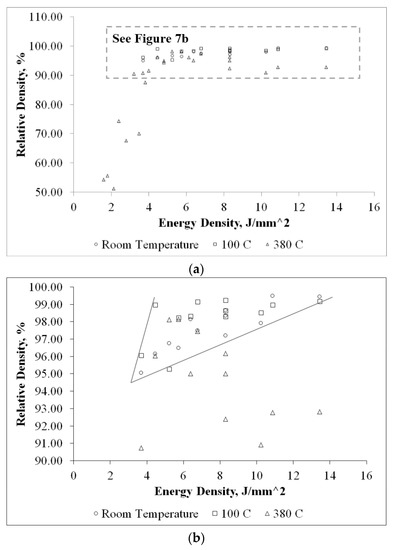 (a) Relative Density (%) as function of Energy Density (J/mm2) for Blend (Alloy A + Alloy B). (b) Specific region highlighted in Figure 7a.