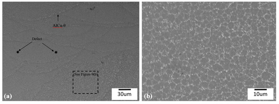 (a) SEM image of Al339 blend (85 wt.% alloy A and 15 wt.% alloy B) processed at 380 °C. (b) Specific region highlighted in Figure 10a.