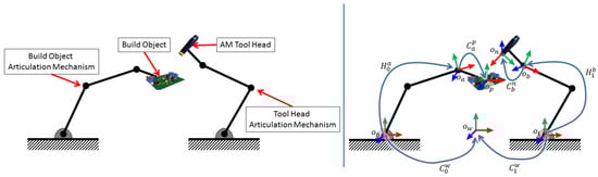 Illustration of fully articulated build-object and tool-head (left), and example coordinate frame assignments with associated transformation definitions (right) highlighting the minimum position/orientation measurements required to achieve conformal AM with this approach.