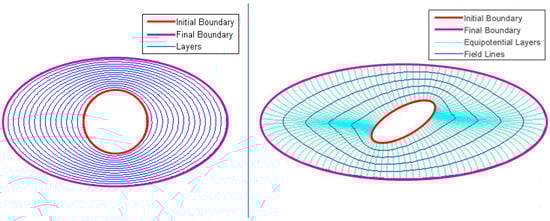 Variable offset curves derived between a build-object defined by a circle and desired object geometry defined by an ellipse (left); and Equipotential curves derived from solutions to Equation (2) (right).