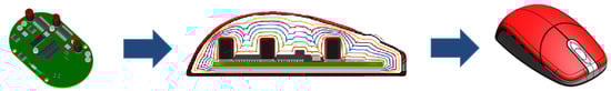 Build-object defined as a 3D CAD model of a populated circuit board (left) and desired surface defined as 3D CAD model of a computer mouse. A cross-section of equipotential curves derived from solutions to (2) equation between the build-object and desired surface is shown in the center.