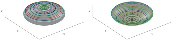 Ellipsoid where with overlaid concentric paths propagated from . Paths on the top of the ellipsoid are shown on the left, and paths on the bottom are shown on the right.