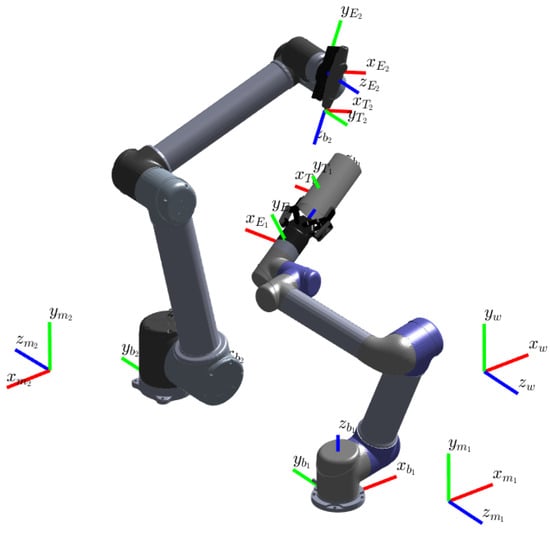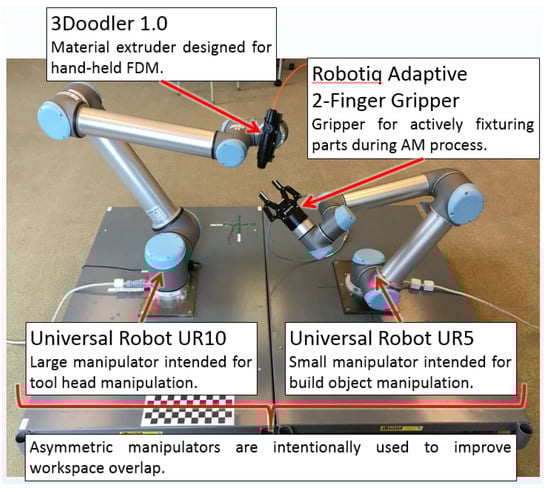 An asymmetric set of two independent six degree-of-freedom (6-DOF) manipulators (UR5 and UR10, Universal Robots A/S, Odense, Denmark), a single gripper (2-Finger Adaptive Robot Gripper, Robotiq Inc., Lévis, QC, Canada), a single tool-head (3Doodler v1.0, WobbleWorks, LLC., Somerville, MA, USA), and a 14 camera motion capture system (OptiTrack Prime 41, NaturalPoint Inc., Corvallis, OR, USA) comprise the system testbed. The asymmetry in manipulator geometry enables a large shared workspace in x, y, z, and tool coordinates. Here, x, y, and z denote the tool position, and denotes the z-direction of the tool frame. Figure 7 provides an annotated view of the system.