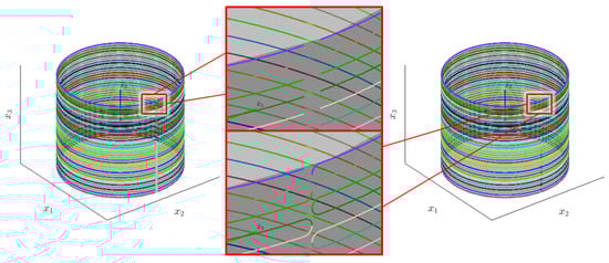 If and when this condition occurs, the ideal solution of two seams per layer must be relaxed. In the case shown in Figure 5, no self intersection for any discrete ring occurs. As such, this layer is associated with a single start point, and a single end point. In Figure 5, we see a self intersection occur near . In this case, a single path must be split or branched based on the p points of intersection , where is defined using the condition presented in Equation (6). The resultant branched paths are described by