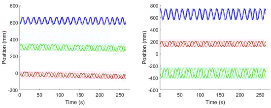 Comparisons of the commanded and measured trajectories show discrepancies that reach and exceed 10 mm in position data, however these results are expected given the analysis of system calibration and control. Given the RMS error measurements associated with of 1.01 mm, and an RMS error for of 1.27 mm; these discrepancies are explained primarily by an orientation misalignment associated with the estimated transformations relating the marker frame to the base frame for each robot. Refining system calibration using the methods described in Section 5.4 will further reduce this error. Analysis of the published performance capabilities for the UR manipulators and motion capture system suggest that this error can be reduced to better than ±1.0 mm. Performance can be further improved using a shared, precision machined base for both manipulators; eliminating tracking errors associated with the motion capture system. As mentioned previously, this approach may limit system versatility. Methods to reduce this error using the tools discussed in Section 5.4 are the subject of ongoing work.