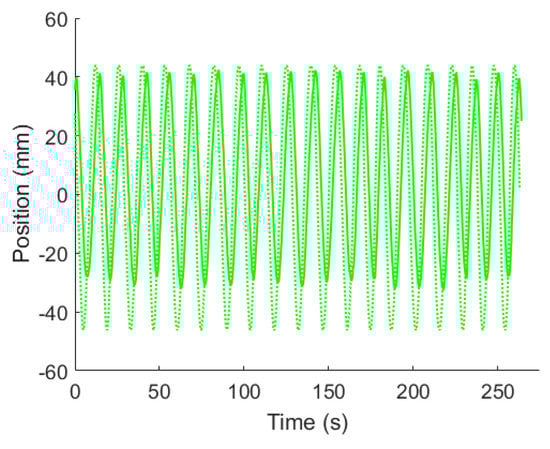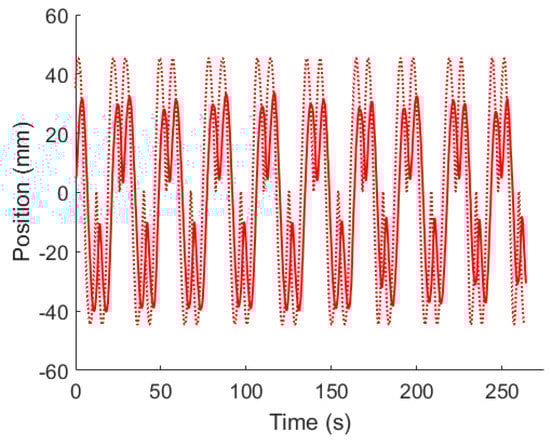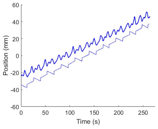 Comparison between the x-position of the actual deposition trajectory and the commanded deposition trajectory. Actual position is represented using a solid line, and command position is represented using a dashed line.