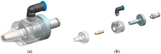 (a) New nozzle solution assembly; (b) exploded diagram of the nozzle.