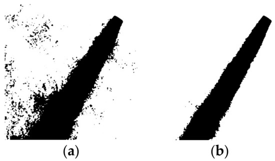 Binary-mask filter: resulting powder flow for different intensity thresholds (carrier = 4.51e−0.5 kg/s; shielding = 2.92e−0.4 kg/s; powder feed rate = 0.14 g/s): (a) intensity threshold of 206; (b) intensity threshold of 198.