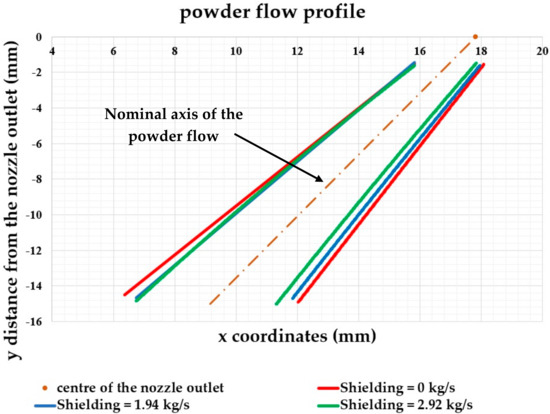 The influence of the shielding gas on the powder flow profile is consistent for every evaluated combination of process parameters and it is well represented in Figure 7. The external flow of inert gas compacts the powder particles at the exit of the nozzle and contrasts the effect of the gravity force that tends to pull down the powder particles, deflecting them from the nominal trajectory imposed by the nozzle geometry. Upon increasing the shielding mass flow rate from 0 to 2.92e−0.4 kg/s, the spread of the powder flow at 15 mm from the nozzle outlet decreases to about −14.6% on average.