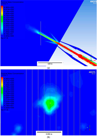 (a) Particle mass concentration along the nozzle axis; (b) particle mass concentration at the deposition plane and the 10 evaluation lines.