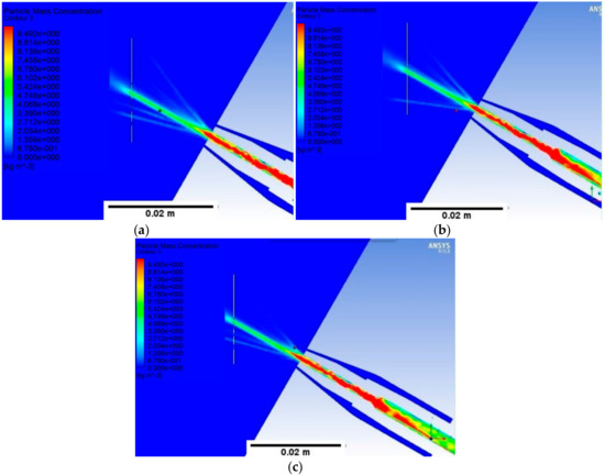 Carrier mass flow rate = 4.51e−0.5 kg/s and powder feed rate = 0.1 g/s: (a) shielding mass flow = 0 kg/s; (b) shielding mass flow = 1.95e−0.4 kg/s; (c) shielding mass flow = 2.92e−0.4 kg/s.