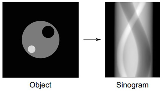 PET scans detect vast numbers of pairs of annihilation photons. The total number of pairs of photons measured by a particular detector pair is proportional to the integrated radioactivity that occurs along the line joining the detector pair. LORs pass through a single point in the patient body and trace a sinusoid curve in the raw data histogram; hence the term sinogram for the raw data format. A simple example of an object in the spatial domain and its corresponding sinogram are illustrated in Figure 1.
