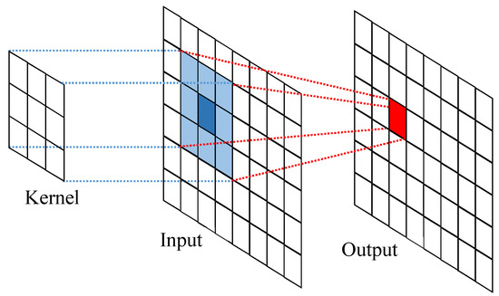 Convolution can be considered a mixing of information. This is achieved by taking an image box from the input image that is the size of the kernel. This experiment uses a image and a kernel, so it would take boxes. An element-wise multiplication with the image box and convolution kernel is performed, and the sum of this multiplication results in a single pixel of the feature map, as depicted in Figure 2, by using a kernel.