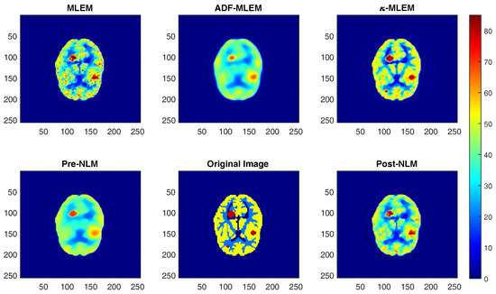As is shown, the visual quality of the reconstructed image of the phantom using the -MLEM algorithm is comparable to the other methods. Indeed, compared to some, the experimental algorithm preserves edges better. There is less noisy projection data, and the reconstruction is more accurate. The method was able to detect the three tumors of different sizes, the smallest of which was not picked up by ADF and pre-NLM and only faint in the post-NLM and conventional MLEM images. Sensitive and reliable visualization of brain tumors is important for medical diagnosis and prognosis.