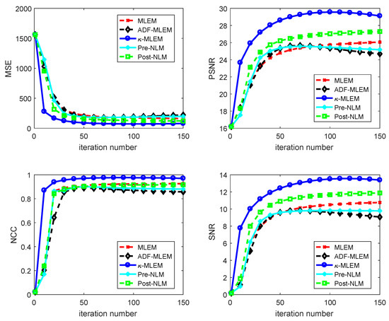 The SNR, MSE, PSNR, and NCC quality measurements of the reconstructed images derived from the proposed algorithm and the other four reconstruction algorithms for the tumor regions of interest (ROIs) of the Hoffman brain phantom selected with a rectangle in (Figure 3) are shown in Figure 5. The minimum MSE achieved by all of the different methods for all iterations are shown Figure 5a. The peak signal-to-noise ratio (PSNR) for each iteration is presented in Figure 5b. The normalized cross-correlation (NCC) and the signal-to-noise ratio values are shown in Figure 5c,d, respectively. These data indicate that the measurements provided by -MLEM are of a higher quality than the other methods tested. Compared to the performance parameters of the other regularization methods, those of the proposed method were enhanced—especially at the lower number of iterations—and remained almost constant after 100 iterations; for the conventional ADF-MLEM and pre-NLM, however, the performance parameters began to decrease after 80 iterations. The data presented in these images indicate that the -MLEM-generated images have the highest PSNR, SNR, and NCC at all iterations and have a lower MSE; thus, the method outperforms the other methods, and this effect is heightened as the iterations increase. We can see the post-NLM algorithm is clearly demonstrating a better performance than all of the other alternative techniques and a performance quite close to the -MLEM method. Indeed, the quality measurements of conventional MLEM at 150 iterations are not dissimilar to those of -MLEM at 50 iterations (Figure 6). The lowest threshold number of iterations the technique needs to create an acceptable reconstructed image is 20, making it fast as well as efficient. -MLEM is also effective in removing star artifacts that are commonly generated by the conventional MLEM algorithm.