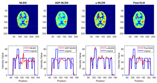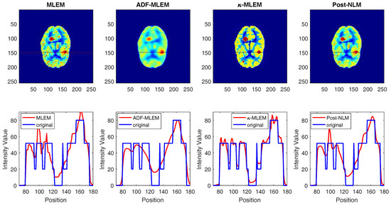 The effectiveness of noise removal for the test algorithm was comparable to that of the post-NLM method; however, the intensity in the region of interest was appreciably higher in the latter. Compared to the other methods, the -MLEM method generates a superior intensity profile, whilst preserving the edges.