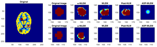 To evaluate the performance of our proposed algorithm in the detection of tumors, we compare the size of tumors of the original phantom and tumors of reconstructed images from different algorithms. The reconstruction outcomes of the simulated phantom yielded the two rectangular areas in Figure 9, which highlight the two smaller tumors. Subsequently, we used a threshold equal to to segment the tumors in PET images. The proposed algorithm successfully preserved the edges of tumors. For example, the middle tumor edges were effectively preserved when applying the proposed algorithm, whereas artifacts and deviations were more likely to occur with the NLM-MLEM and conventional MLEM algorithm and appear distorted with the ADF-MLEM algorithm, as shown in Figure 9. Furthermore, the intensity distribution within the middle tumor was made more homogeneous by the proposed algorithm as compared to the conventional MLEM algorithm. In addition to this, the proposed algorithm could enable the detection of the small tumor with the same size of the original tumor, unlike other algorithms, which did not show tumors at all.