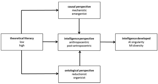 Figure 2 provides a conceptual framework encompassing alternative pathways for the development of new types of intelligence. In particular, different levels of theoretical literacy (low–high) can inform perspectives differently. For example, high theoretical literacy can involve up-to-date knowledge of scientific theories of intelligence (anthropocentric–post-anthropocentric) and how that relates to alternative ontological perspectives (reductionist–organicist) and causation (mechanistic–emergentist). Four propositions from this conceptual framework are stated below.