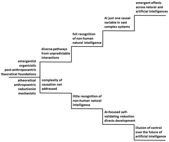 The current framing of AI promotes improving the performance and integration of technologies to enable more sophisticated AI for human purposes. In parallel, philosophical thought experiments are promoted exploring the machine/robot ethics of AI implementations and their potential effects on human beings [87,88,89]. Here, it is argued that the current framing of AI research and philosophy will involve further expansion of the technosphere at the expense of the geosphere as more natural resources are dug up, converted, transported, etc., and more forms of natural intelligence are harmed in the process [54,55,56,57,58]. Moreover, current framing does not promote MI: that is, multi-intelligence hybrid beings and systems combining both natural and artificial intelligences. It has been argued that the current framing of AI research and philosophy needs to be widened. This is because framing provides lasting rationale for thoughts, decisions and actions—even when risks and failings are evident [8,9,10,11,12,13,14,15]. Widening the current framing can be accomplished with reference to scientific research and theories concerned with the nature of intelligence across lifeforms [4,5,6,7]; causation amidst unplanned and planned complexity [44,45]; and emergence from edge effects between formal and informal organizations [79,80,81].