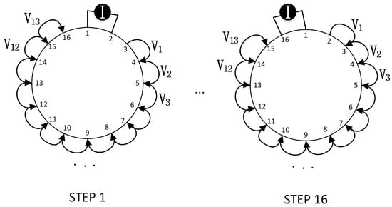 First and last steps of the current injection and voltage measurement sequence are shown for our 16-electrode system. For each step, the current is injected between two electrode pairs, while those remaining are used to measure the corresponding voltages. The process is repeated until every adjacent electrode pair has served for current injection.