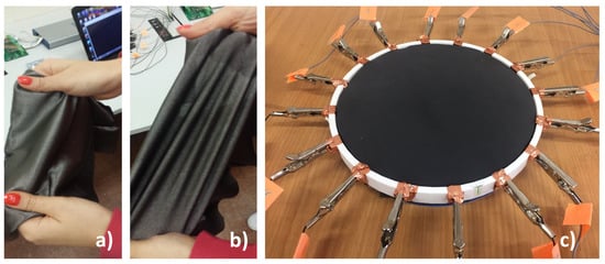 In this paper, we present our 16-electrode sensor, which is based on a conductive stretchable fabric from the Eeonyx Corporation, made with nylon and coated with conductive doped polypyrrole (Figure 4a,b). The material has a surface resistance of 30 K, and it is low-cost and lightweight. A 3D-printed circular frame made of two disc layers is used to house the conductive sheet. The frame presents 16 extrusions, where conductive copper stripes are placed to create the electrodes. The conductive fabric is then placed between the two discs, firmly in contact with the surrounding electrodes, as shown in Figure 4c.