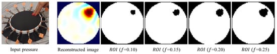 Examples of reconstructed images after a conductivity change has taken place on the stretchable pressure sensor. From left to right, the raw reconstructed image with a positive conductivity change (in red), and the region of interest (ROI) with different threshold factors f.
