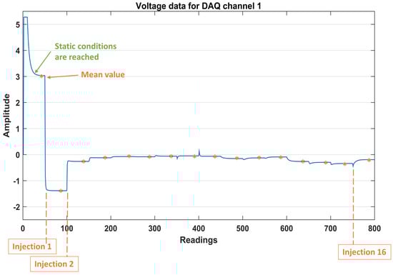 Measured voltage output signal on DAQ channel 1, obtained with 16 sequential DC current excitation signals. Mean values were calculated at each injection time step for each channel after the static conditions were reached, and contributed to creating the final voltage data set.