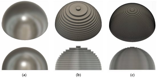 The influence of layer height on additive manufacturing (AM) surface finish (a) Ideal sphere (b) Sphere sliced at 0.8 mm layer height, typical of commercial paste extruders (c) Sphere sliced at 0.25 mm layer height.