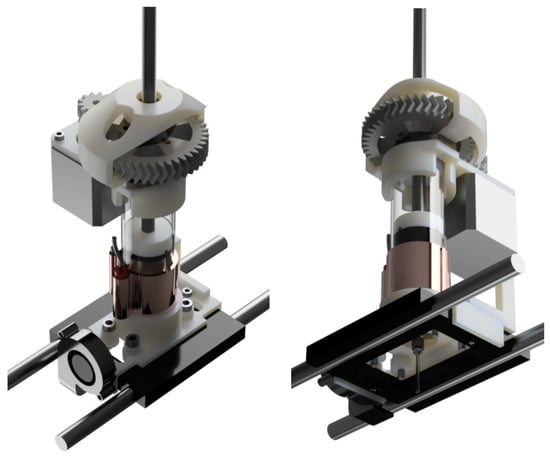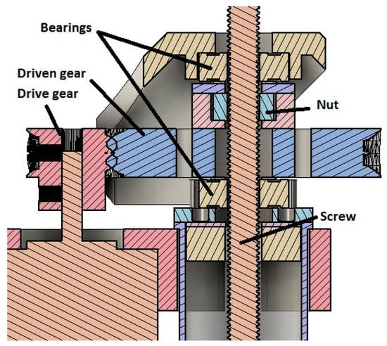 The feedstock is pushed through the nozzle using a piston actuated by a drive-screw and nut mechanism. The stepper motor is fixed in position, and no linear guides are needed, as the nut was pre-tensioned against the drive screw (Figure 5), and the inner rubber seal prevents the drive screw from spinning. The pitch of the drive screw is 1.25 mm.