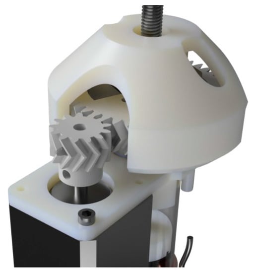 The paste extruder was designed to make use of one of the stepper motors that comes with the thermoplastic material extruders, in order to not modify the 3D printer too much. The stepper motor is a NEMA17-sized motor, which is typically used in desktop 3D printer extruders. The stepper motor is used in 200 micro steps per turn setting. The shaft of the stepper motor is connected to the drive screw through a set of double helical gears with a torque multiplier of 3.3 (Figure 6).