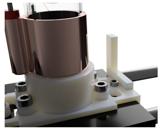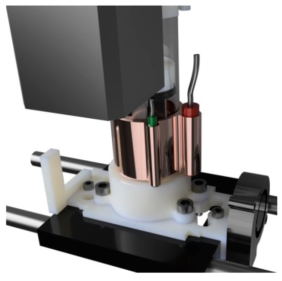 The extruder offers the possibility of heating the feedstock up to 80 °C if the fabrication process requires it. This temperature is achieved using a 30 W ceramic heater and controlled using an NTC 3950 thermistor. The heater and the thermistor are mounted on a copper sleeve attached to the extruder tube (Figure 7).