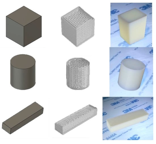 Subsequently, the prototype was used to fabricate a series of test parts: a 20 × 20 × 20 mm cube, a 20 × 20 mm cylinder and a 15 × 60 × 10 bar (Figure 11).