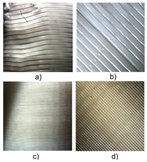 Test sample surface quality (a) Cylindrical surface, silicone (b) Top surface, silicone (c) Cylindrical surface, acrylonitrile-butadiene-styrene (ABS) (d) Top surface, ABS.