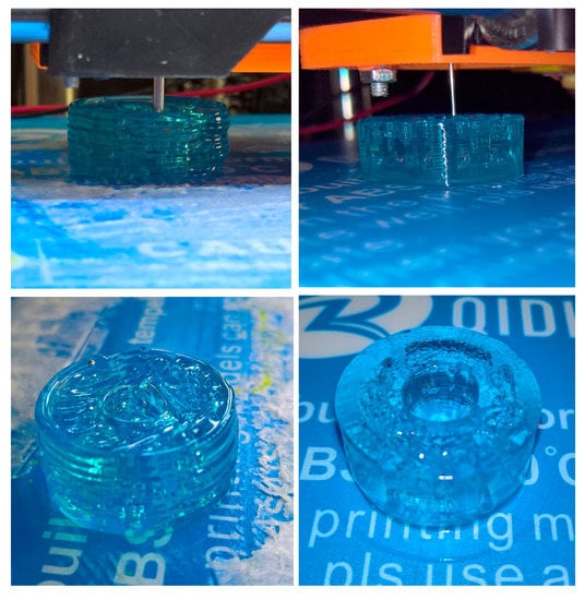 Figure 15 shows two images during the printing process of an ABS part and a silicone part manufactured using the same machine, as proof of the versatility added by our extruder solution to a desktop 3D printer.