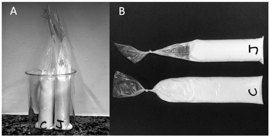The samples were left inside of a beaker (Figure 1A) on the bench for 20 min at room temperature (22 °C), and the milk consistency was checked by touching the bags. Milk clot was observed in the samples with native bromelain (positive reaction). Figure 1B shows the consistency of the milk in two samples after the reaction took place: in the absence (C) and in the presence (J) of pineapple juice.