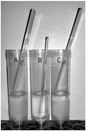 Three samples of 20 mL of gelatin solution (unset gelatin) in 50 mL centrifuge tubes were used. To one tube (Control; Figure 2A), we added 5 mL Milli-Q water; to the second tube (Native Enzyme; Figure 2B) we added 5 mL of fresh pineapple juice, and to the third (Denatured Enzyme; Figure 2C) we added 5 mL of boiled pineapple juice. After 30 min in the refrigerator, the gelatin set in both samples without enzyme (Figure 2A,C), but it was liquid in the sample where hydrolysis occurred (Figure 2B). These samples can be manipulated by shaking up and down or back and forth (closed tubes), or with a glass rod to feel the gelatin consistency. As it can be seen in Figure 2, the glass rod sits on the top of the set gelatin (negative reaction, in A and C) or touches the bottom of the tube when gelatin is liquid (positive enzyme reaction, in B). At the end, the student can also “mix” the samples with the glass rods to check the viscosity.