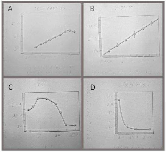 3D representation of graphs. The graphs were printed in a 180 g/m2 paper and the lines and curves were covered up with cold porcelain. The paper was glued in medium-density fiberboard (MDF) boards after the legends and numbers were written in Braille by using a positive slate. The rates are represented as the inverse of the time needed to reach the end of the reaction (min−1) since the product concentration cannot be determined. (A) Effect of substrate concentration: the rate of the reaction (Y axis) varies from 2 to 12 (min−1) and the substrate concentration indicated were: 0.2, 0.6, and 1.0 g/mL of milk. (B) Effect of enzyme concentration: the rate (Y axis) of the reaction varied from 0 to 30 h−1, and the numbers in Braille are for 5, 15, and 25 (h−1). The enzyme concentration varied from 0 to 1.4 mL of juice. (C) Effect of pH: The activity of the enzyme (Y axis) was calculated as a percentage of the highest value obtained in pH 4, and the numbers in the plot indicate the 0%, 40%, and 80% of activity. The pH ranged from 2 to 12, and the numbers in Braille are for pH 4, 8, and 12. (D) Effect of Inhibitor: shows the rate (Y axis) as 1, 3, 5, 7, and 9 min−1 as a function of inhibitor concentration (X axis): 0%, 40%, and 80% of inhibitor are indicated in Braille.