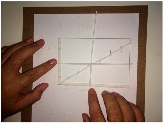 The graphs were plotted in a paper of 180 g/m2 grammage, and the lines (axis and curves) were covered up with cold porcelain. All of the numbers and legends were in Braille, written with a positive slate (TECE). The paper was glued to a piece of medium-density fiberboard (MDF) in order to increase the durability of the 3D graphs. The student was able to recognize the data in the graphs with the help of two guides (20 cm long rods of 1 mm diameter), as shown in Figure 4.