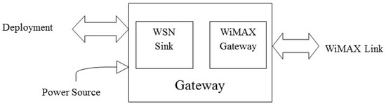 The WSN control unit is a multi-protocol WSN coordinator equipped with a WiMAX gateway device. The gateway is composed of the WSN control unit and the WiMAX gateway. Several manufacturers have tried to create wireless sensor network devices which combine WSN sink coordinator and other wireless communications technologies. Such devices include the Centre Suisse d'Electronique et de Microtechnique (CSEM) WiseGSM (Global System for Mobile Communications) [33] and BeanAir BeanGateway [34] devices which combine WSN with General Packet Radio Service (GPRS). Also studies such as [35,36,37] utilize GSM/GPRS modem with embedded Transmission Control Protocol and the Internet Protocol (TCP/IP) stack to provide wireless TCP-IP connectivity to WSN for remote monitoring. This study proposes to use Waspmote gateway [38] by libelium which has a dedicated socket for solar panel input, hardware interfaces for a 3G plus GPS module, and a maximum communication range of 7 to 12 km. The Waspmote will integrate all the information received from the sensor nodes and calculate their locations and send the text data to the database using the WiMAX gateway. Multiple gateways should be deployed in the neighboring villages using a square grid in which the number of gateways will be determined a priori when planning the WSN and depending on the village size. The initial deployment should maintain network coverage and connectivity using a minimum number of gateways. The static gateway maintains a connection to the server using WiMAX connectivity. The gateways should be fitted with a renewable energy source such as solar power for longer term autonomous operation. The gateways should have a priori information about their coordinates. A schematic diagram of the gateway is shown in Figure 2.