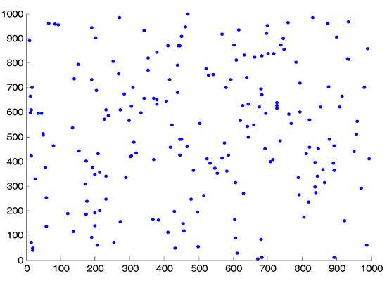 In a given population of 2000 animals, 10% of the animals would be hosting the animal bolus sensors. In Figure 3, 200 sensor nodes are placed randomly in a deployment area. The deployment area of the wireless sensor network is considered as 1000 × 1000 m with 200 randomly deployed sensor nodes as depicted in Figure 3.