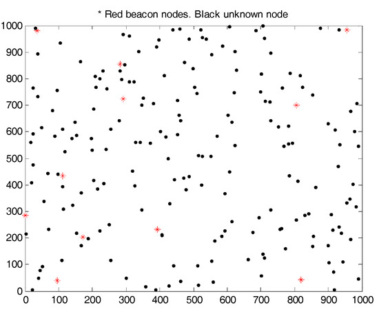 Node distribution with Beacons, where * represents the anchor node and ▪ represents the unknown node.