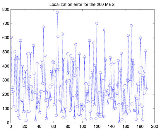 Localization accuracy is determined by how close the estimated position of a node is close to the actual coordinates of the unknown node. An algorithm is deemed to have a good localization accuracy if the node’s estimated position is very close to its actual coordinates. Most range free localization algorithms are prone to location accuracy errors. The error between the actual and estimated MES coordinates of a node can be calculated using Equation (5) as the localization error.